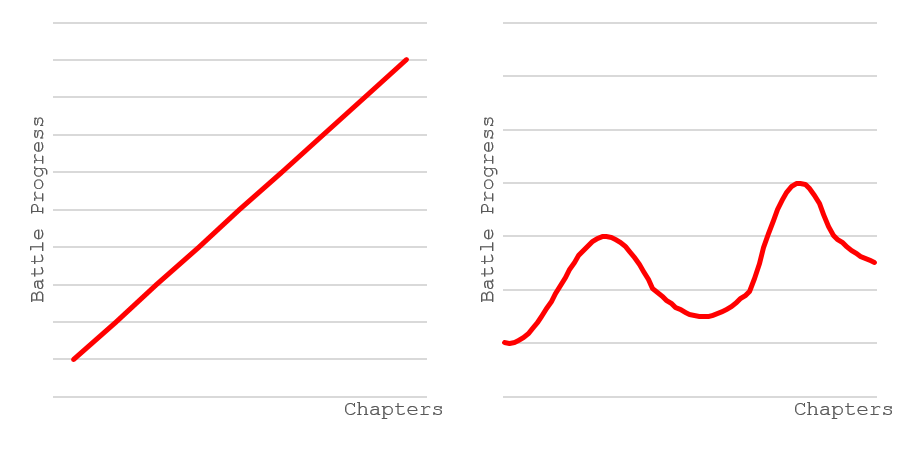 Meanwhile, the basic progression of a traditional wuxia (martial arts) novel is the linear accumulation of power and abilities from start to finish (below left). And all of this differs heavily from the wavering line of traditional literary fiction (below right), with its climaxes and setbacks, which can be observed in some classic works from the early web but is greatly weakened in the current standard format of serialized, constant-satisfaction-seeking internet novels.