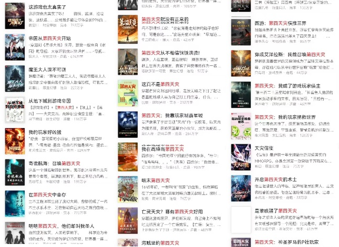 The first Chinese internet novel I ever really got into was about video gamers in a post-apocalyptic world. (I will withhold the title of the novel out of embarrassment.)1 A game-master transports them into the wasteland under the pretense that they are playing a VR game, and by manipulating them with quests, meaningless digital currencies, and promises of exclusive rewards, he manages to build an unstoppable army of blithe gamer warriors willing to carry out his every whim. I was astonished by the creativity of the concept: its humor, its moral ambiguity, its blending of classic sci-fi with manga tropes and game mechanics... It wasn’t until hundreds of chapters in that I discovered that this exact blend of story elements has a name: “Fourth Calamity” 第四天灾 fiction, so called because the arrival of gamers who fear no death and are hungry for loot on an unsuspecting world is an epoch-scale calamity. The Fourth Calamity subgenre is a tiny sliver of the video game novel subgenre, which is only part of the sci-fi and system story (系统文) genres. Novels in this subgenre operate in an incredibly specific range of plots.2 And yet there are a lot of them.